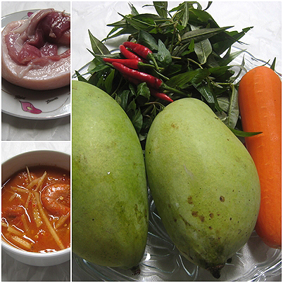 Món nộm xoài thịt heo dùng phồng tôm để xúc ăn, có mùi thơm của riềng, rau răm. Miếng thịt trong và giòn, ăn rất hấp dẫn.
