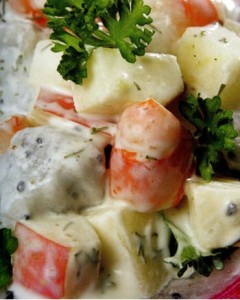 2. Khoai tây luộc chín, thái khối vuông. Tôm luộc chín, bóc vỏ, thái hạt lựu to.