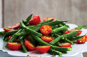 – Dùng một cái tô lớn, cho đậu que và cà chua, củ hành vào. Rưới hỗn hợp nước chanh lên, thêm dầu ô-liu, sau đó trộn đều. Rau mùi xắt nhuyễn cho vào sau cùng.