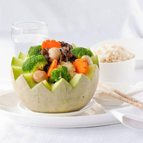 Múc hỗn hợp rau xào vào trong quả dưa, ăn nóng.