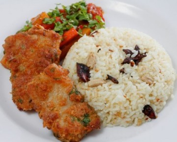 Cho cơm trắng vào chảo có ít dầu, chiên với bột cu min, thảo quả xanh, đinh hương. Cà rốt, khoai tây, cà chua xắt que 5 cm ( ½ xắt hạt lựu), hành tây xắt sợi, đậu hòa lan rửa sạch.