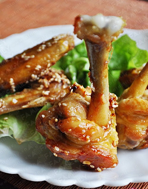 – Cánh gà được áo bên ngoài lớp đường vàng óng, thơm lừng mùi mè rang thì bạn tắt bếp, lấy cánh gà ra đĩa, dùng nóng.