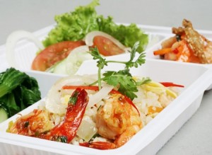 Trình bày: Cho cơm chiên vào ém chặt, úp tô cơm ra đĩa, trang trí cùng rau thơm, ớt tỉa hoa.