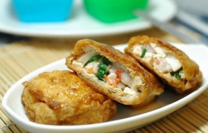 Những miếng đậu rán đã nguội, bạn dùng kéo cắt một đường ở bên cạnh, rạch ở giữa để tạo lỗ rỗng trong miếng đậu. Dùng thìa nhồi đầy nhân tôm vào, làm nhẹ nhàng khéo léo để vỏ đậu không rách.
