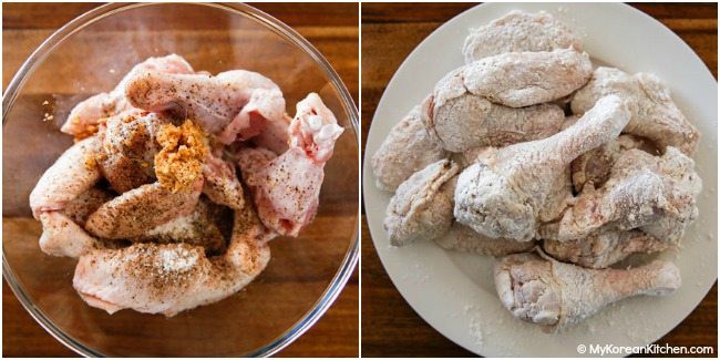 Sau đó lăn từng miếng thịt gà qua phần bột ngô để miếng thịt bám đều bột.