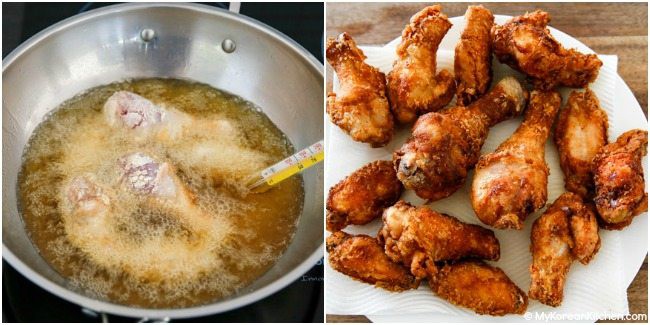 Đặt chảo sâu lòng lên bếp, đổ dầu ăn vào đun sôi. Thả gà vào chiên. Bạn lưu ý lượng dầu phải ngập thịt gà, chiên nhỏ lửa để thịt gà chín kỹ. Sau khi gà vàng đều gắp ra đĩa đã lót sẵn giấy thấm dầu.