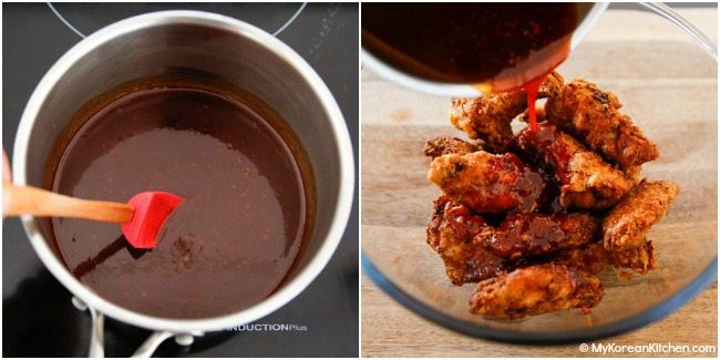 Trong một nồi khác, cho toàn bộ phần sốt vào, đun sôi thì tắt bếp. Thịt gà chiên cho vào tô, đổ phần nước sốt lên trên đảo đều để thịt gà bao trọn phần sốt.