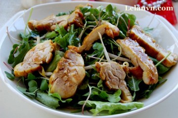 Gà chiên trộn sà lách May 14, 2012 $ave Nguyên liệu: 500g rau sà lách các loại (rau và mầm salad) 300g thịt gà (không da, không xương) 1/2 muỗng cà phê muối ½ muỗng cà phê bột nghệ Chút tiêu và dầu chiên Các bước thực hiện: Bước 1 Gà ướp với muối, tiêu và bột nghệ cho thấm. Cho 2 muỗng canh vào chảo bật bếp cho nóng tiếp theo cho thịt gà vào chiên với lửa nhỏ (lửa nhỏ cho thịt chín tới bên trong). Thịt gà vàng trở bên cho đều và chín. Vớt ra cho ráo dầu và chờ nguội, cắt lát mỏng. Bước 2 Dầu giấm đen : Hòa tan 2 muỗng canh dầu ăn, 1 muỗng canh dấm đen, ¼ muỗng cà phê muối cho tan. Salad cho lên dĩa, thịt xung quanh và rưới nước dầu dấm lên. Khi ăn trộn đều. Nguồn từ trang: lelanvn