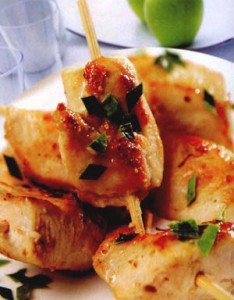 2 thìa cà-phê đường, 1 thìa súp tương ớt, que tre xiên.