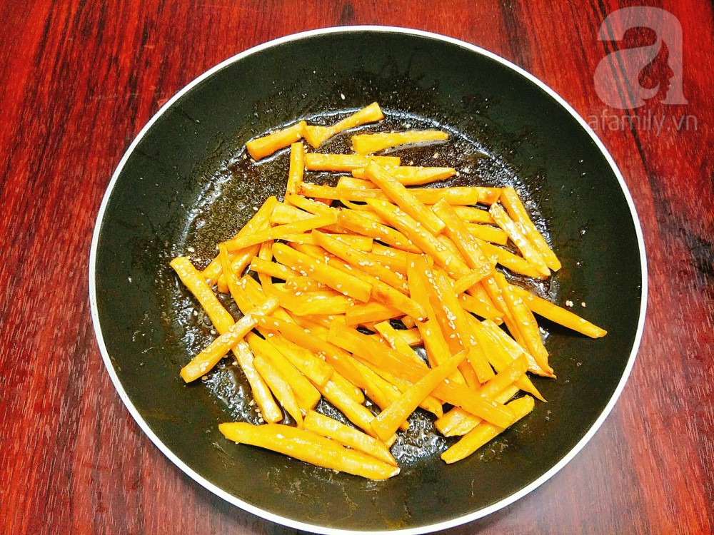 Trút khoai ra đĩa, rắc vừng trắng đã rang lên trên mặt là có thể thưởng thức được ngay.