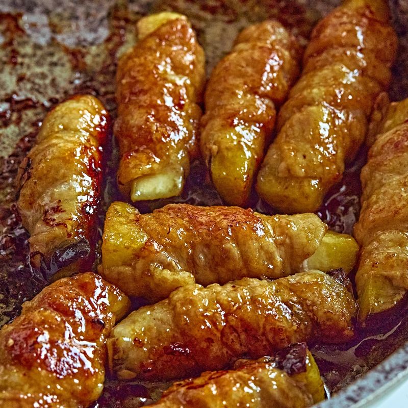 Chả giò cà tím cuộn thịt heo là một món ăn độc đáo, kết hợp giữa vị mềm ẩm của cà tím và hương vị thơm ngon của thịt heo. Thịt heo thái mỏng được cuộn trong cà tím, phủ một lớp bột và rưới nước tương ngọt mặn, tạo nên lớp vỏ ngoài vàng nâu, bên trong mềm ẩm. Đây là một lựa chọn tuyệt vời cho bữa cơm nhà trong tiết trời mùa thu se lạnh.