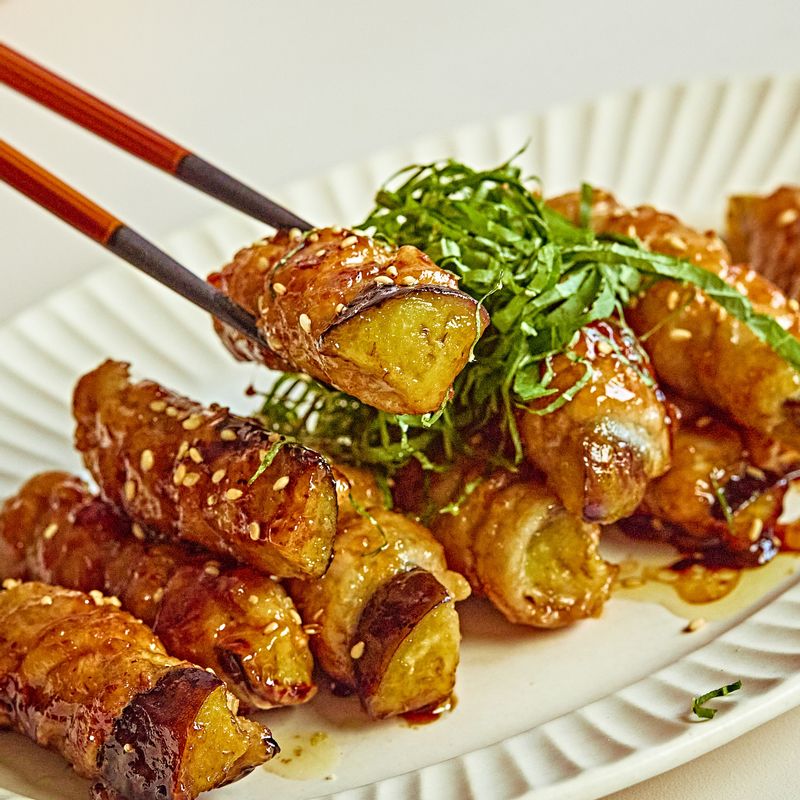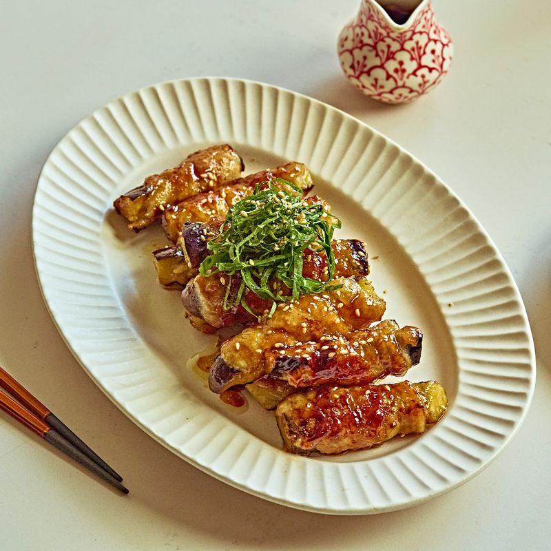 2 quả cà tím, 200g thịt ba chỉ thái lát mỏng (có thể dùng thịt bò hoặc thịt heo hay nhúng lẩu), 3 thìa canh tinh bột, 3 thìa canh dầu ăn, một ít lá tía tô, một hạt vừng trắng, 1 thìa canh nước tương, 1 thìa canh rượu mirin, 1 thìa canh rượu gạo, 1/2 thìa canh đường.