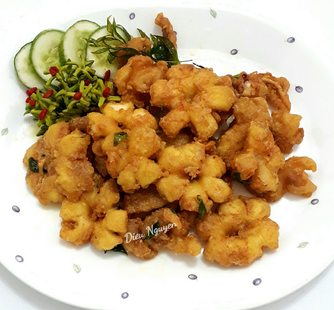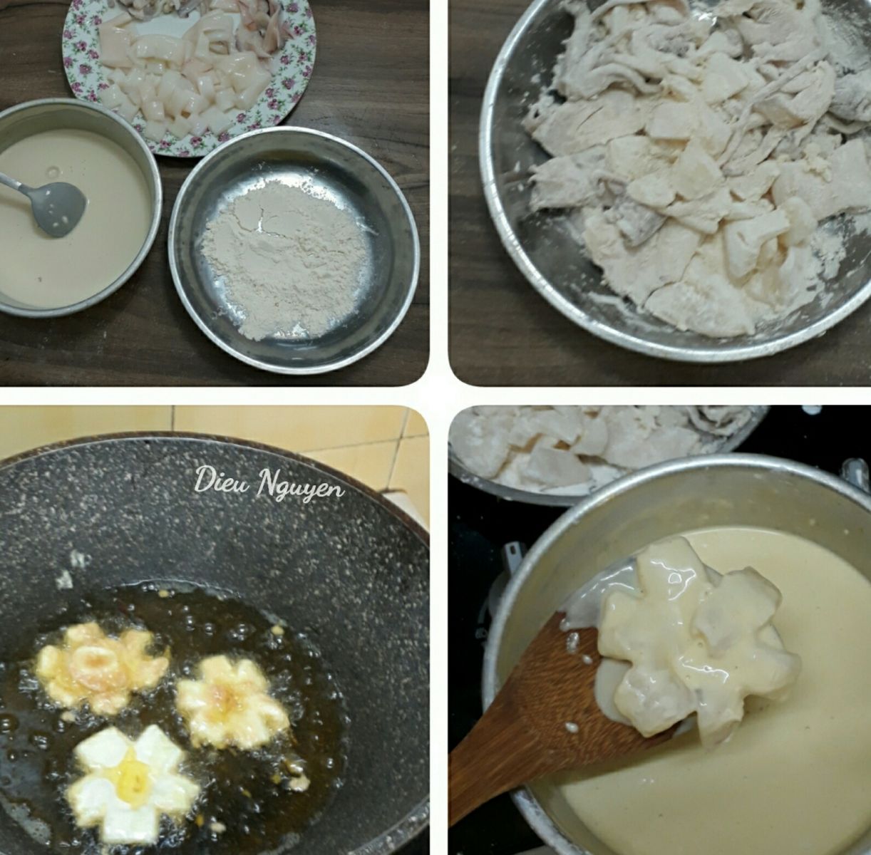 - Phần mực áo đều vào lớp bột khô sau đó cho từng miếng mực vào bột ướt. Dầu sôi thả từng miếng mực vào chảo chiên ngập dầu mực vàng vớt mực ra để ráo dầu.