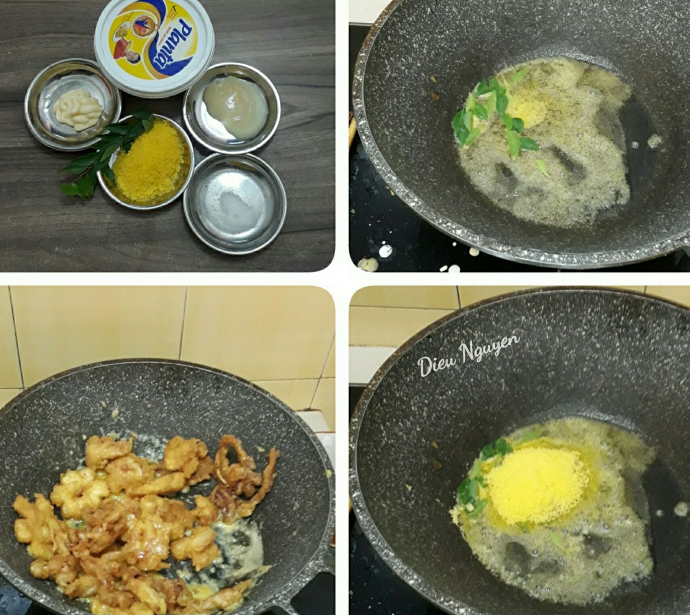 - Cho bơ vào chảo bơ nóng chảy cho lá cari và lòng đỏ trứng muối khuấy đều, thêm muối, sốt mayonnaise, sữa đặc nêm nếm lại vào khuấy nhanh tay cho hỗn hợp hòa quyện sau đó đổ tắt cả mực đã chiên vàng vào nhanh tay đảo đều cho sốt được áo hết mực, tắt lửa .