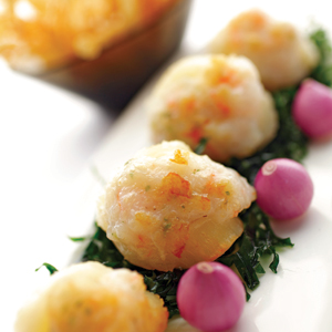Sò điệp quết tôm ăn kèm với nấm bào ngư lăn bột chiên giòn, chấm tương xí muội hoặc tương ớt.