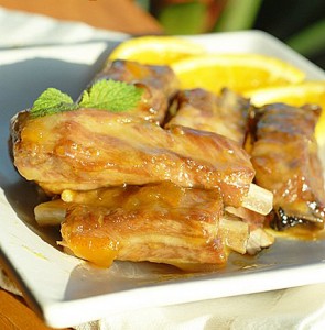 Bày sườn ra đĩa, thái những lát cam mỏng trang trí