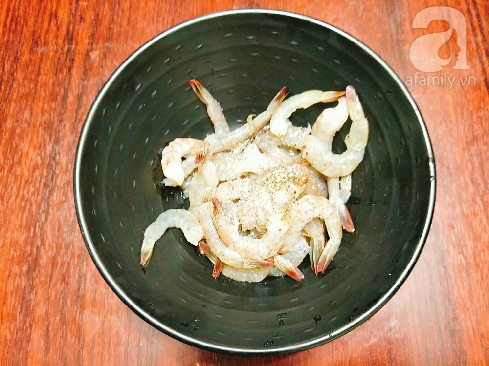 Tôm rửa sạch rồi đem bóc vỏ, chừa lại phần đuôi tôm để nguyên vỏ, bỏ đầu tôm. Cho tôm vào bát to và thêm chút muối, tiêu sau đó trộn đều và ướp tôm 15 phút cho ngấm gia vị.