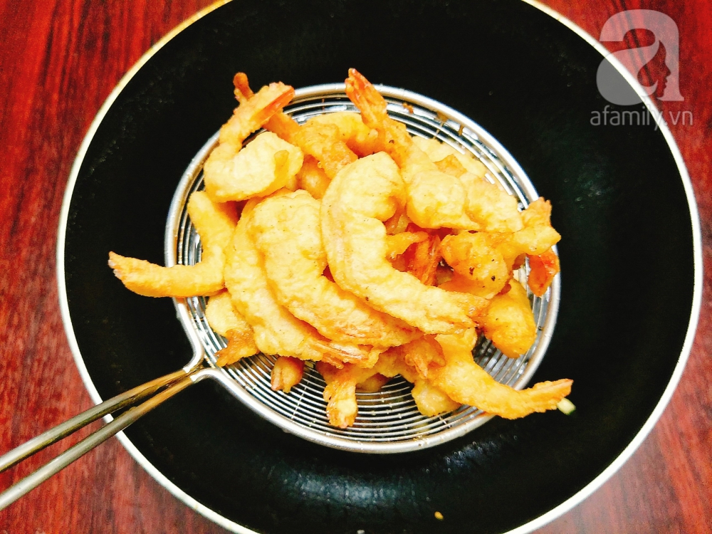 Đặt chảo dầu lên bếp đun cho dầu nóng sau đó bạn lấy từng con tôm nhúng vào bát bột ướt, gắp ra cho vào chảo dầu chiên, cứ như vậy bạn làm nhanh tay và chiên cho tới khi tôm chín vàng giòn thì vớt ra để cho tôm ráo dầu.