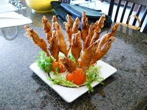 Lấy 1 cái nồi sâu lòng ,cho dầu ngập cỡ chiều dài của con tôm. Nhớ kéo đuôi tôm và mấy cái chân nhỏ của tôm cho tia tỉa ra khi chiên mới đẹp. Cầm que tre nhúng tôm vô dầu nóng. Chiên đến khi tôm chín vàng là được.