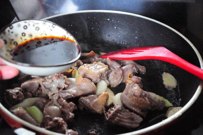 Cho ít dầu ăn vào chảo, thêm hành, tỏi, gừng, ớt vào xào thơm. Tiếp đó cho thịt bồ câu, rượu và nước tương vào đảo đều.