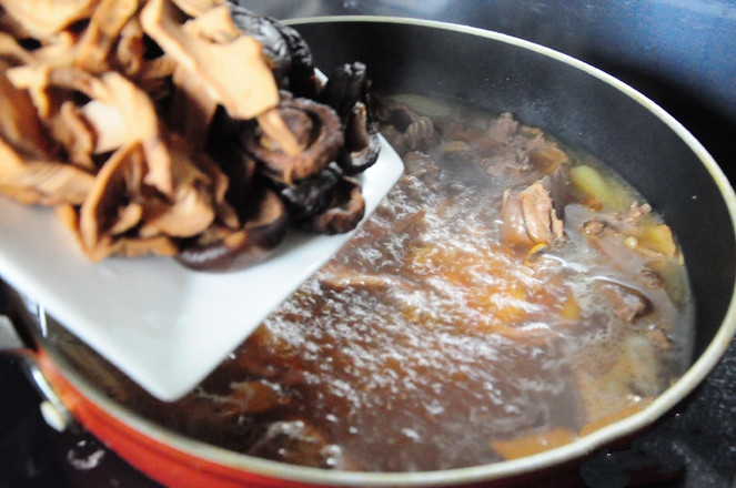 Thêm nước nóng ngập mặt thịt đun sôi rồi hạ nhỏ lửa đun khoảng 30 phút thì thêm măng, nấm vào đun chung.