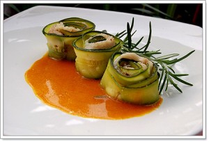 Trình bày bí cuộn cá ra dĩa cho tí dầu olive lên cùng nước xốt nghệ thêm nhánh rau thơm hoặc lá romarin tuỳ thích. Ăn nóng rất ngon.