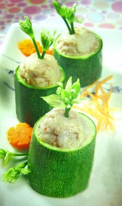 Bí ngòi rửa sạch, cắt khúc khoảng 4cm, dùng thìa cà phê móc bỏ ruột (để lại một ít ruột bên dưới làm đế chứa tôm)