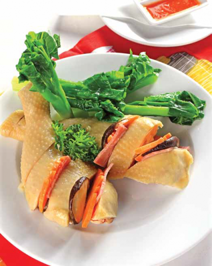 Xếp gà hấp ra đĩa, rưới nước xốt lên, dùng nóng.