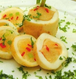 Mực nhồi xôi February 26, 2012February 26, 2012 $ave Nguyên liệu: Mực ống 2 con Xôi 1/2 chén Ớt chuông xanh, đỏ, vàng 30gr Nấm đông cô 3 cái Bột nêm, dầu ăn, tương ớt Các bước thực hiện: Bước 1 Mực làm sạch. Ớt chuông cắt hạt lựu. Nấm đông cô thái sợi, trộn đều ớt, nấm vào xôi cùng bột nêm. Nhồi xôi đã trộn vào thân mực. Hấp chín mực, rồi chiên vàng. Bước 2 Cắt mực thành khoanh, trang trí ra đĩa. Mực nhồi xôi ăn với tương ớt. duc.bkv