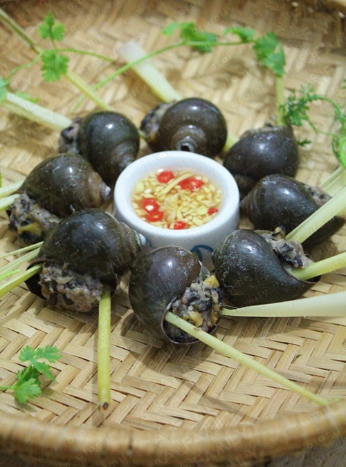 – Hấp xong bạn lấy ốc nhồi thịt ra đĩa, ăn nóng chấm kèm nước mắm gừng và ít lá chanh sẽ rất hợp.