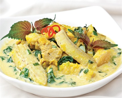 – Đun sôi nước thêm 1M mẻ, cho chuối vào luộc sơ chưa chín, vớt ra để ráo, ướp với 1M nước cốt nghệ.