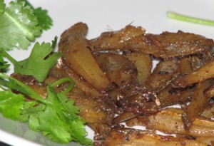 Hành khô đập dập, phi thơm vàng, cho cá đã ngâm vào đảo đều. Để lửa to vừa. Khi thấy cá se khô, dậy mùi thơm thì cho nước mắm chua ngọt đã pha vào.