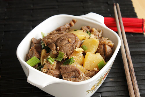 – Đun lửa vừa đến khi thịt mềm, nêm nếm lại tùy theo khẩu vị của bạn, tắt bếp thêm hành lá đã thái nhỏ. Múc ra đĩa, rắc một ít hạt tiêu lên bề mặt dùng nóng với cơm trắng. |