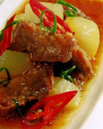 Thịt kho củ cải trắng March 7, 2012March 7, 2012 $ave Nguyên liệu: 300g thịt nạc dăm 100g củ cải trắng 1 thìa cà phê tỏi băm 1 thìa cà phê đường 1/2 thìa cà phê muối 1 thìa cà phê hạt nêm 1/2 thìa cà phê tiêu 2 thìa súp dầu ăn Các bước thực hiện: Bước 1 Thịt nạc dăm rửa sạch, để ráo, cắt vừa ăn. Ướp thịt với ít muối, hạt nêm, tiêu, đường, để thấm 10 phút. Củ cải trắng gọt vỏ, rửa sạch, cắt khúc ngang khoảng 5-7cm, chẻ dọc làm tư hoặc làm sáu tùy theo củ cải to hay nhỏ. Bước 2 Phi tỏi băm với dầu ăn, cho thịt vào xào khoảng 5 phút cho lên màu vàng để lửa vừa. Cho tiếp củ cải vào, thêm nước vừa ngập thịt và củ cải, nấu đến khi nước còn khoảng 1/3, nêm gia vị vừa ăn. Cho thịt ra đĩa, dùng nóng. Nguon: kingkong991