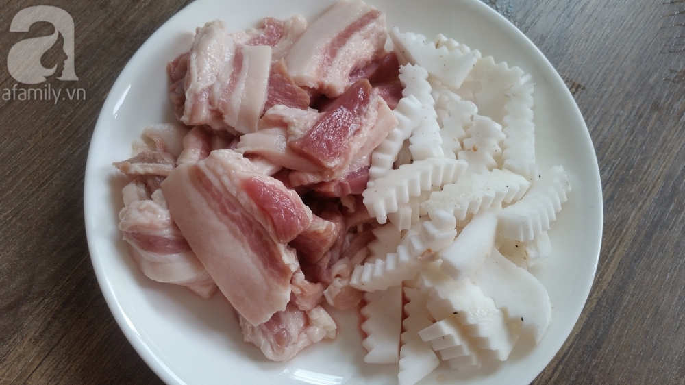 Thịt rửa sạch, để ráo, thái miếng vừa ăn, rồi ướp thịt với ½ phần hành khô, tỏi băm nhỏ, 1 thìa hạt nêm, 1,5 thìa nước mắm, 1 thìa bột ngọt, ½ thìa tiêu bột, 1 thìa dầu ăn trong 30 phút cho thịt ba chỉ ngấm đều gia vị.