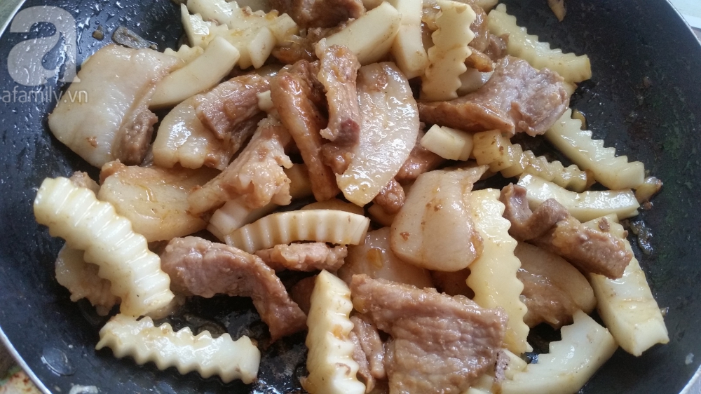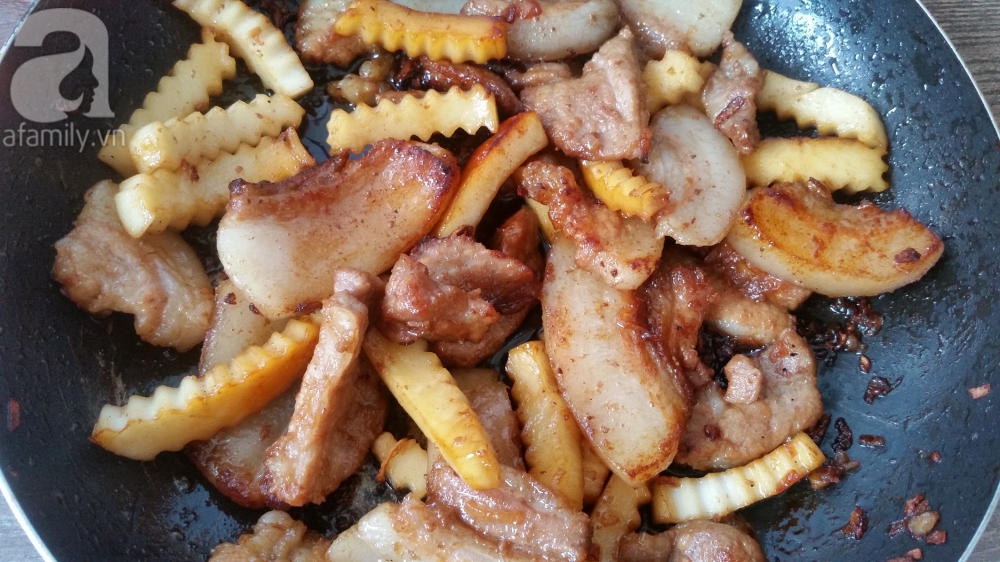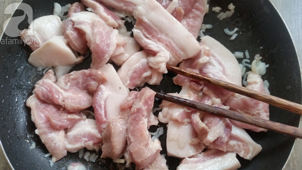 Phi thơm hành, tỏi cùng chút dầu ăn, cho phần thịt đã ướp vào xào đều. Để thịt trên bếp khoảng 5 phút.