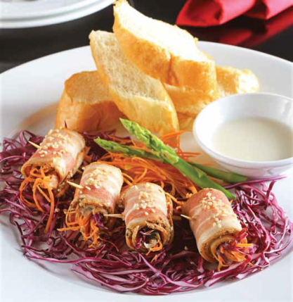 Trải thịt ba chỉ đã ướp sữa lên mặt phẳng sạch, cho bắp cải tím, cà rốt, hành tây, măng tây vào giữa, cuốn lại dùng tăm gim chặt lại. Làm lần lượt cho đến hết.