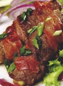 – Quấn thịt bò và thịt xông khói xen kẽ xung quanh cây sả. Nướng chín vàng que thịt trên lửa than hoặc trong lò