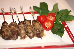 -Thịt chín rất nhanh, khi chín tới thì bỏ ra nếu không sẽ rất khô. Bày thịt ra đĩa rồi bọc cán que xiên bằng giấy bạc cho vệ sinh và dễ ăn.