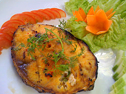 – Cá bóp nướng muối ớt chấm muối ớt rang, ăn kèm cùng rau răm.