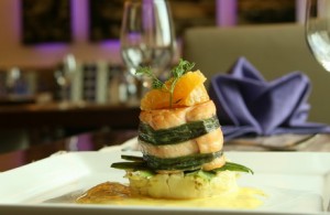 – Trình bày trên đĩa: Làm nóng đĩa bày đồ ăn và đổ phần khoai tây nghiền vào giữa đĩa, tạo thành hình tròn. Lần lượt đặt đậu bắp lên phần khoai tây nghiền, sau đó là miếng cá hồi. Rưới nước xốt xung quanh.