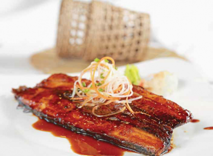 Cho cá sanma ra đĩa, rưới đều xốt teriyaki, rắc hành lá lên trên. Ăn nóng với các loại rau củ và mù tạc.