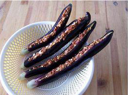 Cà tím rửa sạch, cắt cuống xanh bỏ đi. Dùng dao rạch 1 đường dọc thân quả, chú ý không cắt rời hẳn mà chỉ tạo 1 khe rãnh ở giữa quả cà.