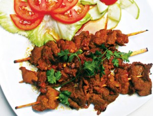 Tiếp tục cho bơ vào trộn đều với thịt gà. Dùng que xiên lần lượt 1 miếng gà, 1 miếng ớt chuông, 1 miếng hành tây rồi nướng trên lửa than vừa đến khi chín vàng.