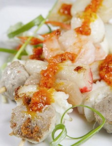 Sò điệp, tôm bỏ vỏ, mực, thanh cua, cá viên, bò viên cắt miếng vừa ăn, xiên vào que. Lấy sốt sa-tế quét lên, đem nướng vàng.