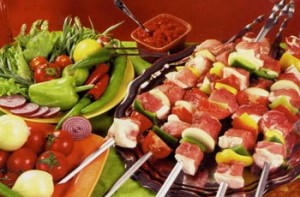 Ớt chuông, hành tây, cà chua thái miếng vừa ăn. Dùng xiên xiên xen kẽ thịt, ớt chuông, hành tây, cà chua với nhau rồi đem nướng trên lửa than hồng.