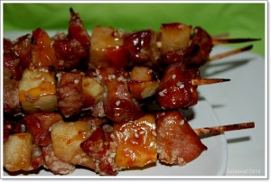 Xiên xen kẽ 1 miếng thịt và miếng táo cho đến hết. Rắc mè lên trên.