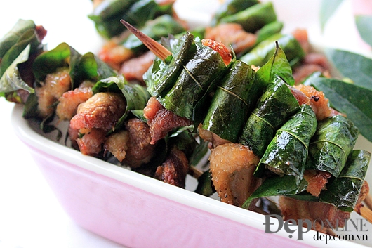 Từng miếng thịt vịt sau khi nướng có màu vàng ruộm đẹp mắt, phần lá thấm đẫm mỡ vịt có độ giòn rụm và ánh lên màu xanh bóng rất hấp dẫn.