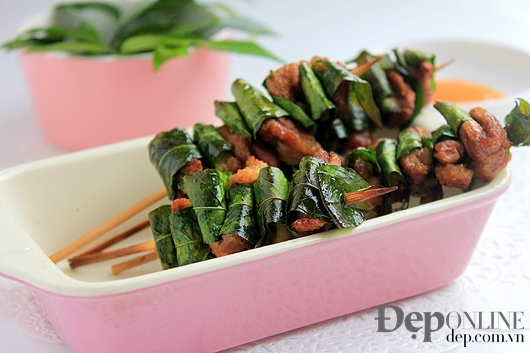 Từng miếng thịt vịt sau khi nướng có màu vàng ruộm đẹp mắt, phần lá thấm đẫm mỡ vịt có độ giòn rụm và ánh lên màu xanh bóng rất hấp dẫn.