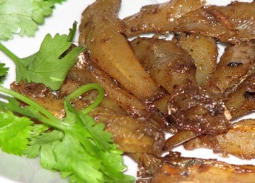 Hành khô đập dập, phi thơm vàng, cho cá đã ngâm vào đảo đều. Để lửa to vừa.